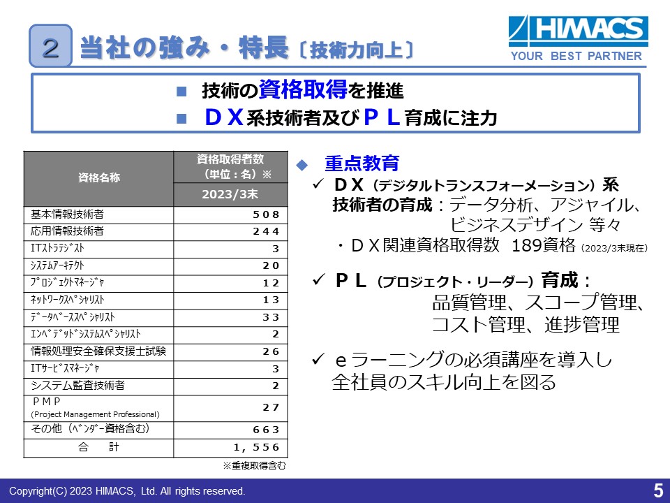 資格取得者には社内表彰するなど、積極的にチャレンジしてもらう仕組みを設け、推奨しています。この実績は業界でも誇れる水準であると自負しています。また、特にDX系技術者の育成とPL(プロジェクト・リーダー)の育成に注力しています。