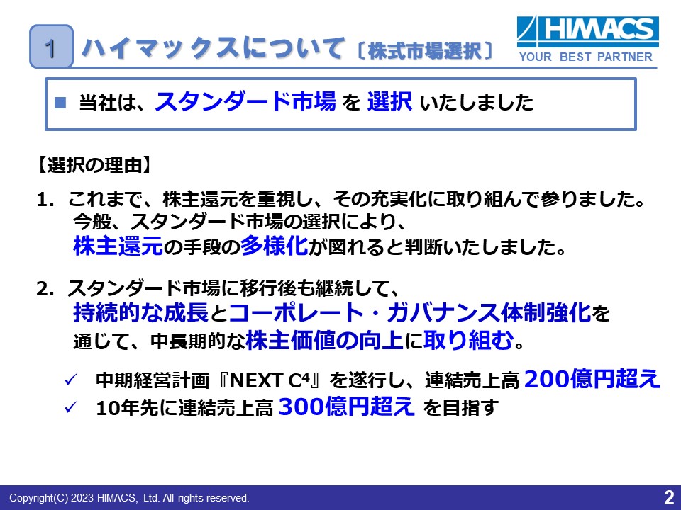 その結果、当社はこれまでも株主還元を重視し、その充実化に取り組んできましたが、スタンダード市場の選択により、株主還元の手段が多様化すると判断しました。また、その他にも、株主・投資家の皆様に安心して当社株式を保有・売買していただける環境を確保することも非常に大切であると考えました。なお、スタンダード市場に移行してからも、引き続き、持続的な成長とコーポレート・ガバナンス体制の強化を通じて、中長期的な株主価値向上に取り組むことに変わりはありません。まずは、新たに作成した3ヶ年の中期経営計画を遂行し、連結売上高200億円超えを達成、10年先には、300億円超えを目指します。ご理解いただければ幸いです。