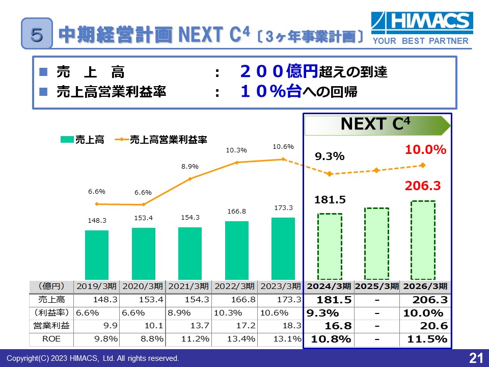 当中期経営計画で示す業績計画については、先ほどの説明通り、2024年3月期では増収減益の見込みですが、最終的には売上高206億円と、200億円超えを計画しています。また、利益面についても、売上高営業利益率10%と再度、増収増益基調に戻る計画です。