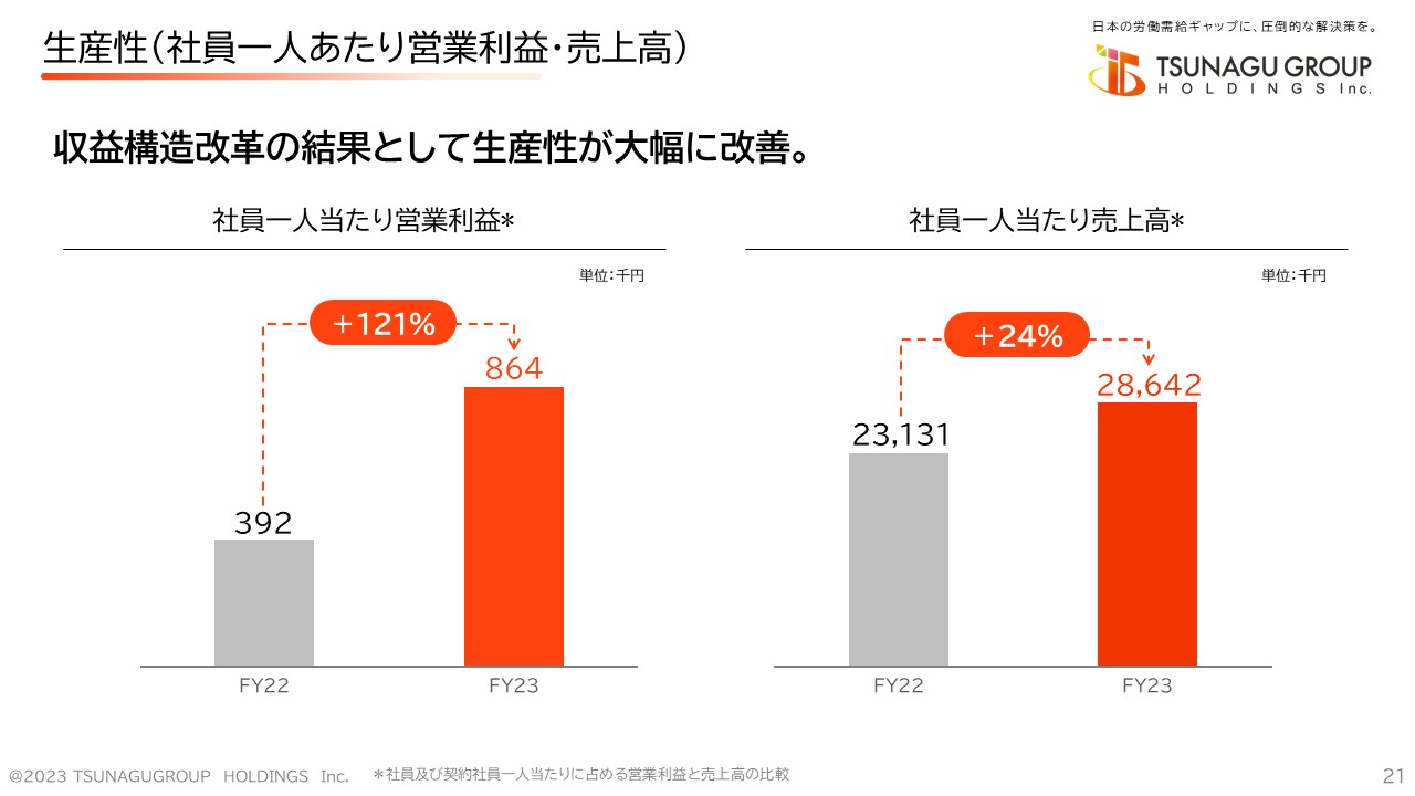 三井:決算説明資料では、生産性(社員1人当たりの営業利益・売上高)も大幅に改善しているとのことですが、御社だけではなく、たくさんの企業様が人材に関する取り組みに注力されてると思いますが、その点についても伺えますか。