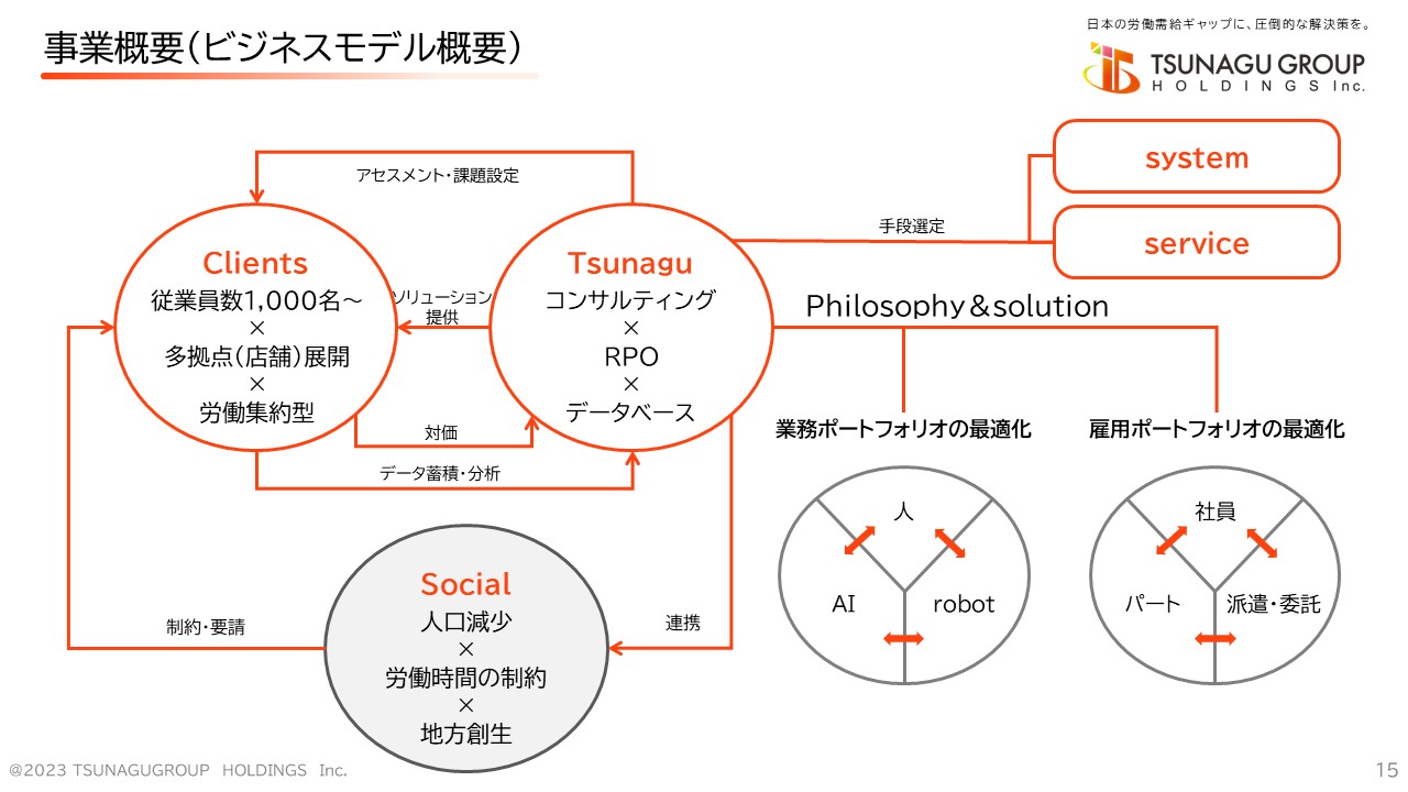 また、雇用ポートフォリオは、その職場は正社員だけで運営すべきものなのか、それともパートタイマーを組み合わせでやるべきものなの か、もしくはアウトソーシングするべきものなのかを見直す必要があります。この業務ポートフォリオと雇用ポートフォリオをいかに最適化するかというコンサルティングが今後求められてくると考えてい ます。当社は業務ポートフォリオと雇用ポートフォリオの最適化をご提案をし、当社のシステムやサービスといった手段を提供し、その会社の採用課題を解決に導きます。それを積み重ねることによって、人口減少に伴う社会課題解決に向けた当社のビジネスモデルを推進し、我々自身も成長していきたいと考えています。
